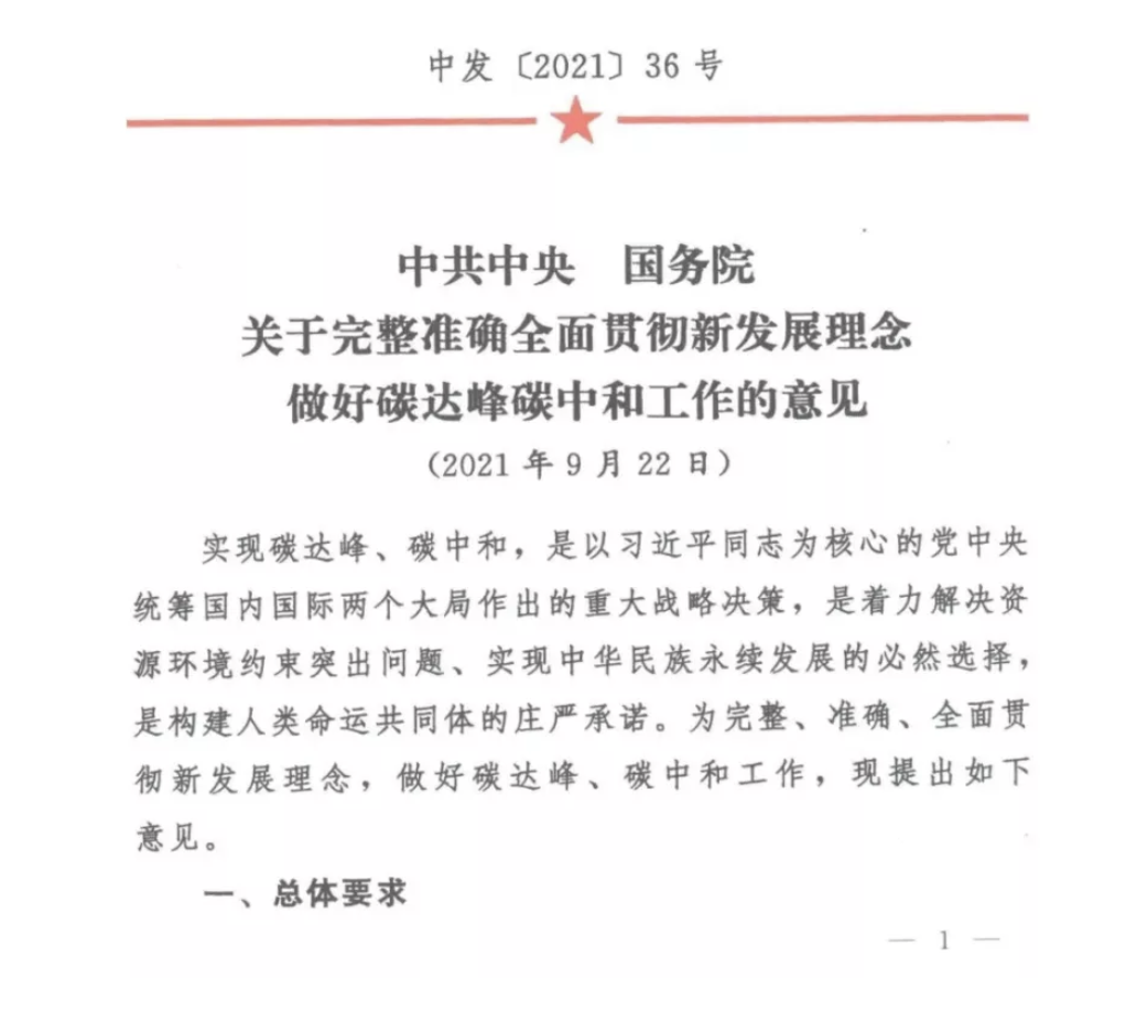 9月22日,中共中央下發(fā)《關(guān)于完整準確全面貫徹新發(fā)展理念做好碳達峰碳中和工作的意見》。