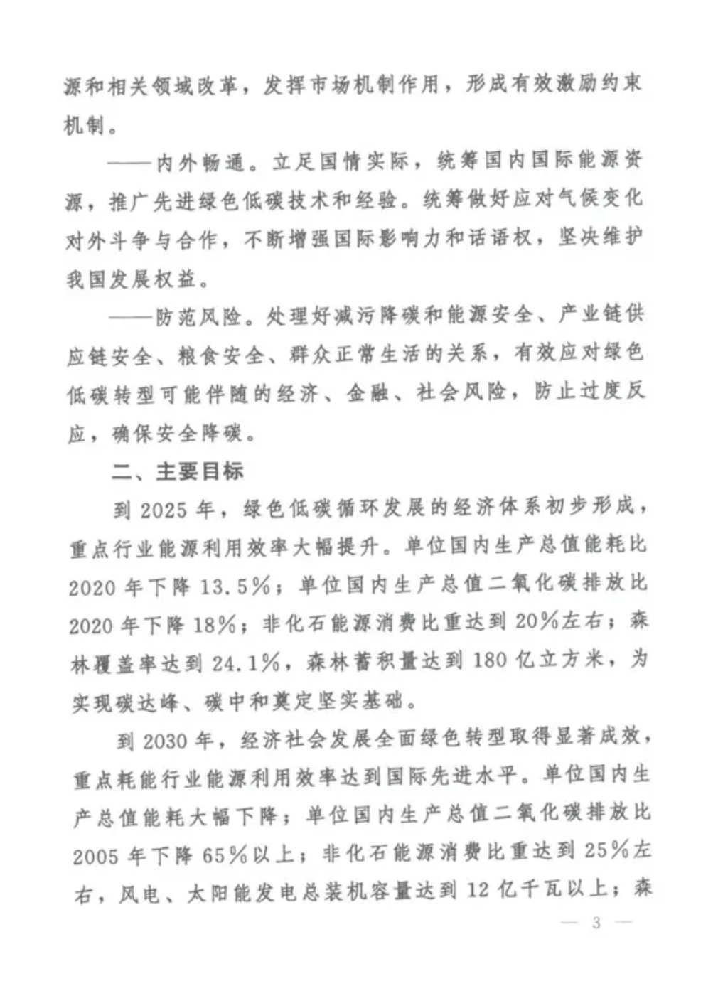 到2025年,單位國內(nèi)生產(chǎn)總值能耗比2020年下降13.5%;單位國內(nèi)生產(chǎn)總值二氧化碳排放比2020年下降18%;非化石能源消費比重達到20%左右;森林覆蓋率達到24.1%,森林蓄積量達到180億立方米。