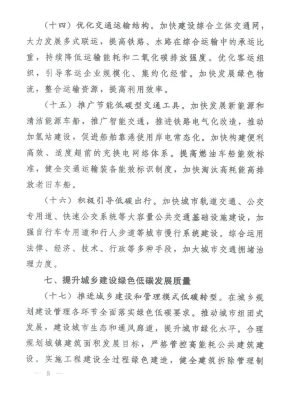 (十七)推進城鄉(xiāng)建設(shè)和管理模式低碳轉(zhuǎn)型。在城鄉(xiāng)規(guī)劃建設(shè)管理各環(huán)節(jié)全面落實綠色低碳要求。推動城市組團式發(fā)展,建設(shè)城市生態(tài)和通風(fēng)廊道,提升城市綠化水平。合理規(guī)劃城鎮(zhèn)建筑面積發(fā)展目標,嚴格管控高能耗公共建筑建設(shè)。實施工程建設(shè)全過程綠色建造,健全建筑拆除管理制度,杜絕大拆大建。加快推進綠色社區(qū)建設(shè)。結(jié)合實施鄉(xiāng)村建設(shè)行動,推進縣城和農(nóng)村綠色低碳發(fā)展。