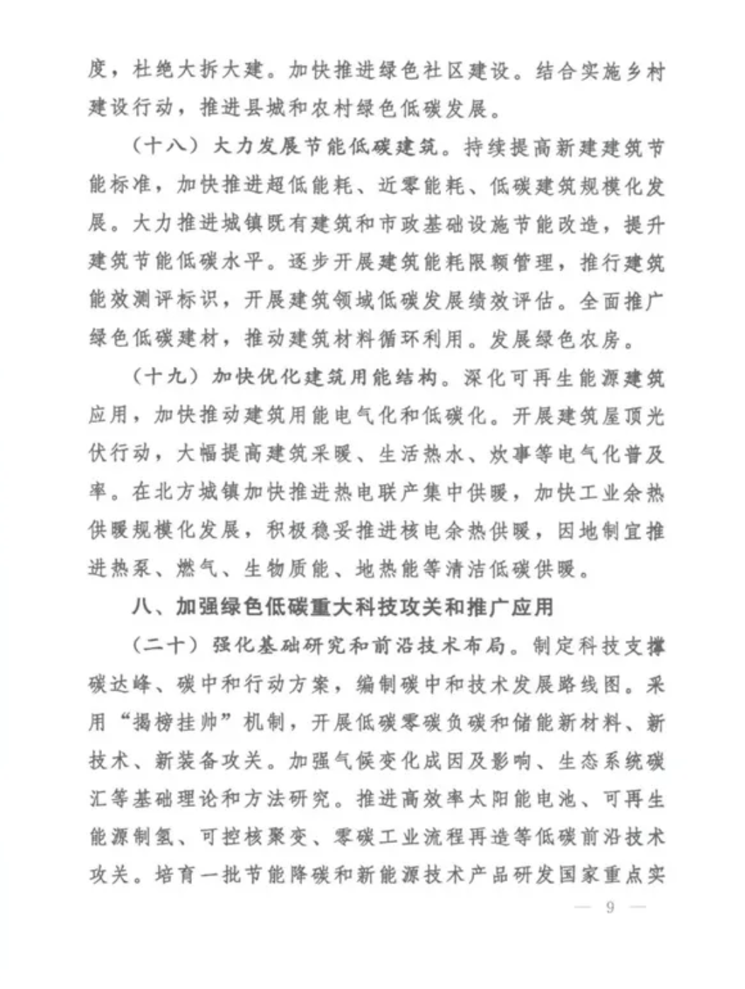 (十八)大力發(fā)展節(jié)能低碳建筑。持續(xù)提高新建建筑節(jié)能標準,加快推進超低能耗、近零能耗低碳建筑規(guī)?;l(fā)展。大力推進城鎮(zhèn)既有建筑和市政基礎(chǔ)設(shè)施節(jié)能改造,提升建筑節(jié)能低碳水平。逐步開展建筑能耗限額管理,推行建筑能效測評標識,開展建筑領(lǐng)域低碳發(fā)展績效評估。全面推廣綠色低碳建材,推動建筑材料循環(huán)利用。發(fā)展綠色農(nóng)房。