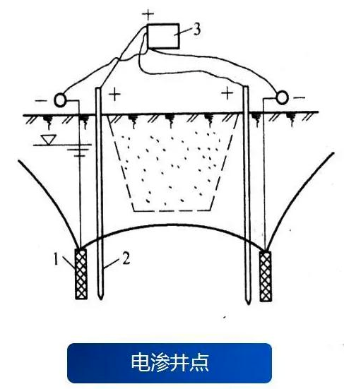 電滲井點適用于滲透系數(shù)很小的細顆粒土,如黏土、亞黏土、淤泥和淤泥質(zhì)黏土等。這些土的滲透系數(shù)小于 m/d,用一般井點很難達到降水目的。利用電滲現(xiàn)象能有效地把細粒土中的水抽吸排出。它需要與輕型井點或噴射井點結(jié)合使用,其降低水位深度決定于輕型井點或噴射井點。在電滲井點降水過程中,應(yīng)對電壓、電流密度和耗電量等進行量測和必要的調(diào)整,并做好記錄,因此比較繁瑣。